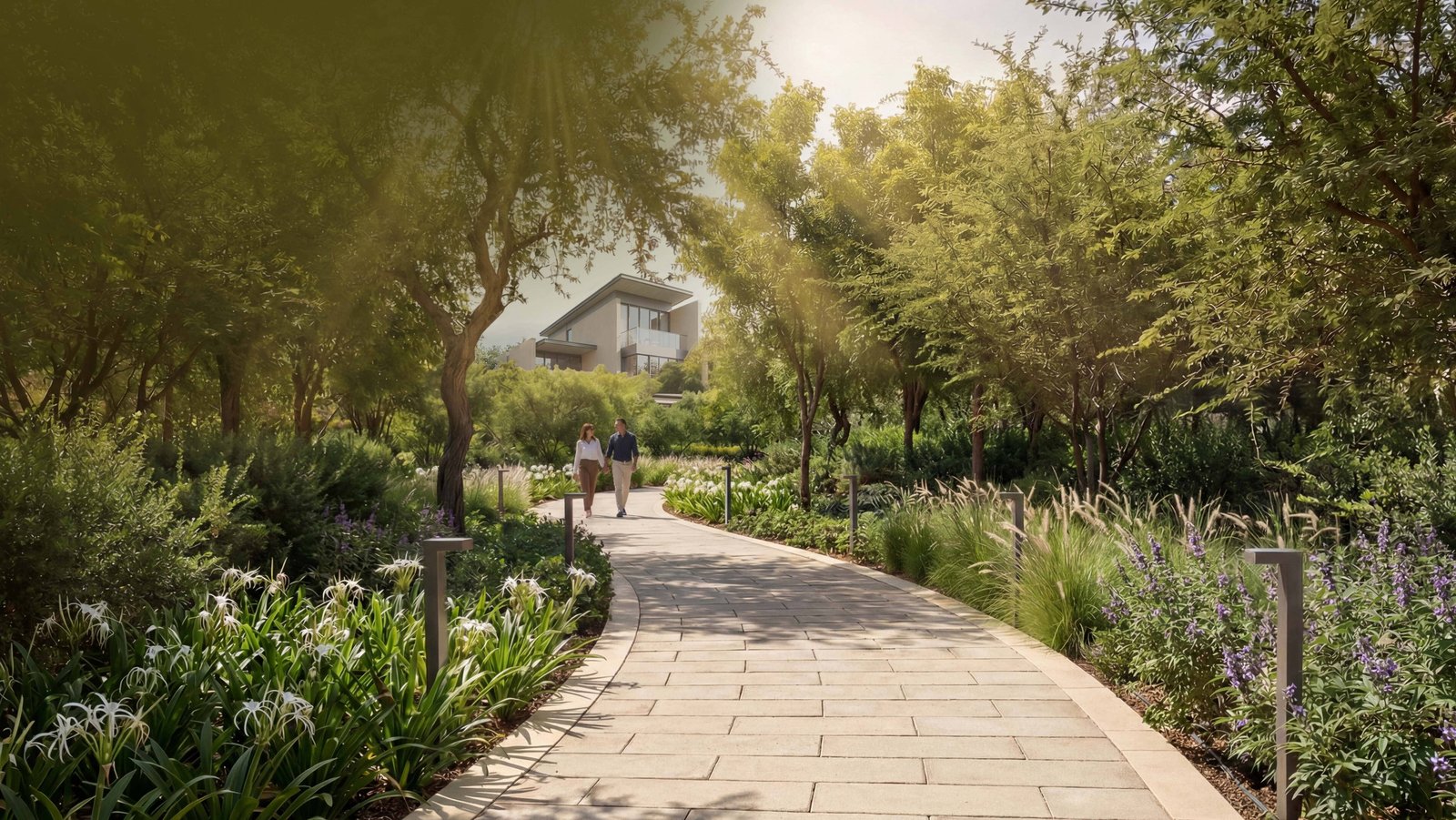 • The Terraces offer contemporary garden villas designed around light, openness, and privacy, with seamless indoor–outdoor living and access to a nature-led masterplan.
